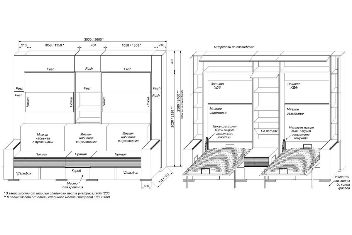 Дополнительные опции, такие как: освещение, зарядное устройство, розетки, мягкое изголовье, матрас - не входят в стоимость шкаф-кровати "Twin". Вы всегда можете самостоятельно их добавить в опциях или написать менеджеру при оформлении заказа.